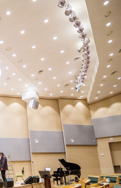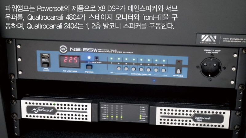 그리고 천장에 보기 좋게 살짝 매립된 UB12Si는 각각 한 개의 5.25인치급 LF유닛과 HF유닛의 조합으로 60~20kHz의 대역을 117dB/SPL로 출력해 보조스피커로 부족함 없는 성능을 발휘한다. 더불어 미려한 디자인으로 시각적인 아름다움을 완성해냈다. 전체 스피커 시스템을 구동하는 파워앰프는 Powersoft의 제품으로 X8 DSP 단 한대로 메인스피커와 서브우퍼를 구동하며 Quattrocanali 4804는 스테이지 모니터와 front-fill을, Quattrocanali 2404는 1, 2층 발코니 스피커를 구동한다. 이 중 발코니 스피커를 구동하는 Quattrocanali 2404는 방송실에 위치해 있으며, 나머지 앰프들은 모두 무대 바로 옆에 위치한 창고 내부 랙에 장착되어 배선을 최소화했다. SoundGrid 시스템으로부터의 출력은 DiGiGrid IOX를 통해 아날로그로 전송되고 있다.
