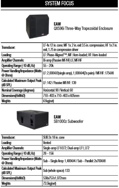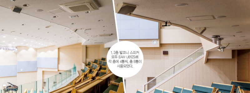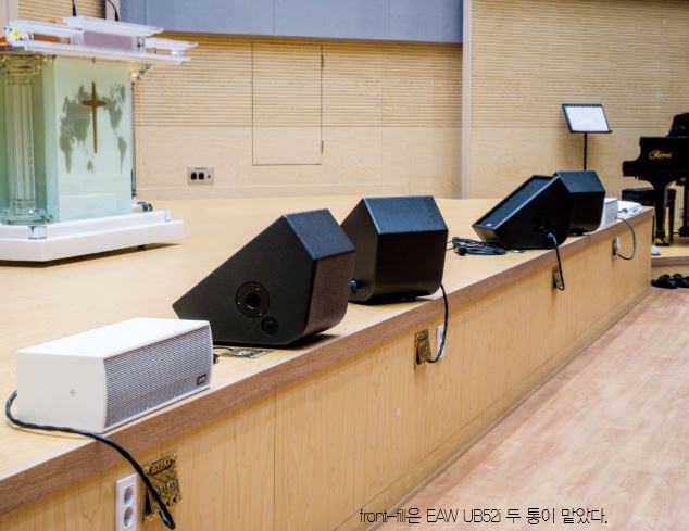 본당의 음향시스템은 메인 시스템, front-fill, 1층 언더발코니, 2층 오버발코니 등 4개의 구역으로 나눠 확성되고 있다. 이 중 메인 스피커는 EAW QX596i로 QX500 시리즈는 가로 지향각 40º부터 90º까지, 세로 지향각 40º부터 60º까지 총 5개의 모델이 준비되어 있어 현장 상황에 맞는 모델을 고를 수 있다. 이번에 사용된 QX596i는 명칭에서 짐작할 수 있듯이 90º ×60º로 시리즈 중 가장 넓은 지향각을 제공하는 모델이다. 사다리꼴의 아름다운 인클로저 형상은 인스톨 현장에서 큰 장 점이지만 컴팩트한 외형과는 달리 12인치급 LF유닛을 무려 4개나 내장하고 있으며 MF와 HF유닛은 서로 하나처럼 합쳐진 동축 유닛으로 평탄한 중고역대 반응을 자랑한다. 성능은 55Hz~20kHz의 대역을 LF는 142dB/SPL, MF/HF는 139dB/SP 으로 출력해낼 정도로 강력하다. 이 아름다운 스피커와 조합된 서브우퍼는 EAW SB1000Z 이다. 18인치 유닛 두 개를 내장하고 있지만 특유의 ‘clam shell’디자인과 독특한 vented loading 방식을 채용해 컴팩트한 외형을 유지하고 있다. 28~156Hz의 대역을 133dB/SPL로 출력하는 성능도 인상적이다. 자칫 대충 넘어갈 수 있는 보조 스피커도 EAW로 브랜드를 통일해 사운드 캐릭터를 동일하게 맞춰냈다. front-fill은 UB52i로 5.25인치급 LF유닛이 두 개와 하나의 HF유닛 조합으로 50Hz~18kHz의 대역을 119dB/SPL로 출력한다.