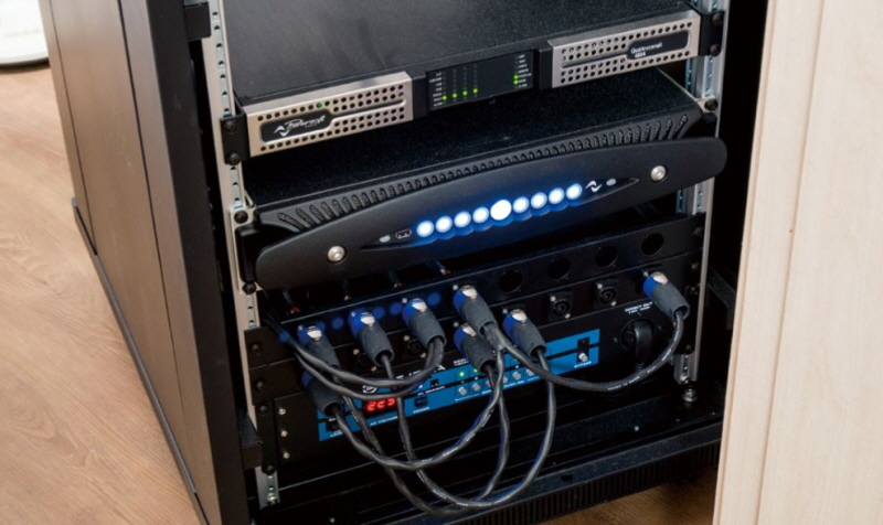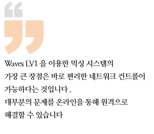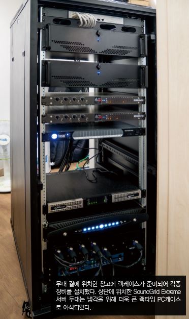 안정성 면에서는 “일반적인 디지털 콘솔도 일종의 컴퓨터나 마찬가지이기 때문에 현재의 시스템이 뒤쳐질 이유는 없다고 생각합니다. 호스트 PC는 검증된 조합으로 구성했고 Waves Extreme 서버는 두 대로 이중화 구성을 했습니다. 현재 레이턴시, 안정성, 사용편리성, 유연성 모든 면에서 만족스럽습니다”라고 소감을 밝혔다. 그리고 “Waves LV1을 이용한 믹싱 시스템의 가장 큰 장점은 바로 편리한 네트워크 컨트롤이 가능하다는 것입니다. 제가 사정상 교회에 없을 때에도 대부분의 문제를 온라인을 통해 원격으로 해결할 수 있습니다. 무엇보다 컴퓨터나 태블릿을 이용한 원격 컨트롤이 타사처럼 제한된 기능만을 제공하는 것이 아니라 모든 기능을 제어할 수 있기 때문에 매우 편리하죠”라고 덧붙였다. 무대 옆에 위치한 창고에 랙케이스가 준비되어 있는데 상단에는 SoundGrid Extree 서버가 두 대 설치 되어 있었다. 외형이 시판하고 있는 제품과 다르지만 SoundGrid 서버가 범용 PC와 구조가 매우 흡사하다는 것에 착안해 더욱 나은 냉각과 안정적인 구동을 위해 한층 넉넉한 사이즈의 서버용 랙케이스로 리케이싱한 점이 주목할 만하다.