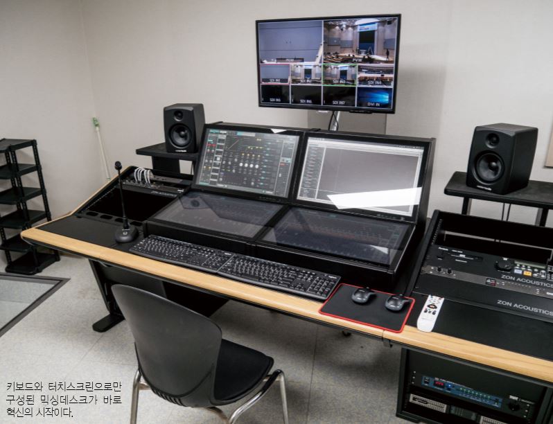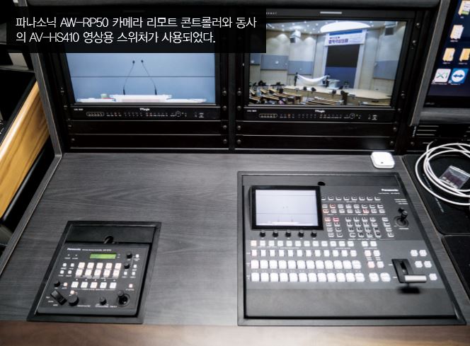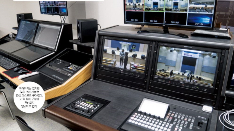 단출하지만 강력한 영상 시스템 상용 컨트롤 데스크는 화려하지는 않지만 디지털 기술을 적극 활용해 많은 것이 가능하다. 가장 중심이 되는 영상 스위처는 파나소닉 AV-HS410으로 구성했으며 카메라 리모트 컨트롤러는 동사의 AW-RP50을 사용했다. 이와 같이 맞물리는 PTZ카메라 역시 파나소닉 제품으로 AW-HE40s이다. 영상 백업용 레코더는 현장에서 널리 사랑받는 BlackMagic Design의 H.264 대응 제품이며, 전체 인프라는 SDI-HDMI컨버터를 사용해 장거리 전송은 HD-SDI 로, 방송실 내 단거리 전송은 HDMI로 해결하고 있다. 그 외에 프리뷰 및 프로그램 모니터로 TV Logic의 LVM-182W를 사용한 것이 주목할 만한 부분이다. 많은 방송실들이 예산 등의 이유로 범용 모니터를 사용하고 있는데 비해 전문 영상 업체의 장비를 선정해 정확한 색감 및 명암 모니터링을 가능하도록 했다.