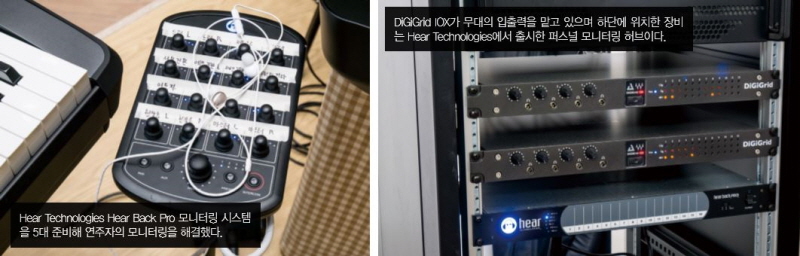 무대의 입출력과 앰프로의 아날로그 전송은 DiGiGrid IOX 가 맡고 있으며 퍼스널 모니터링을 위해 Hear Technologies의 장비가 사용된 점이 특이하다. 아직 국내에는 널리 알려지지 않은 이 장비는 프로버전의 경우 16채널의 입력 소스를 사용자가 직접 믹싱할 수 있는 퍼스널 모니터링 장비이다. 랜케이블을 이용한 daisy-chain방식으로 최대 32대의 믹서를 연결할 수 있으며 PoE를 통해 별도의 전원이 필요없는 편리성이 특징이다. 또한 전력이 모자랄 경우를 대비해 파워서플라이를 이용해 전원 이중화 구성으로 안정성을 높일 수도 있다.