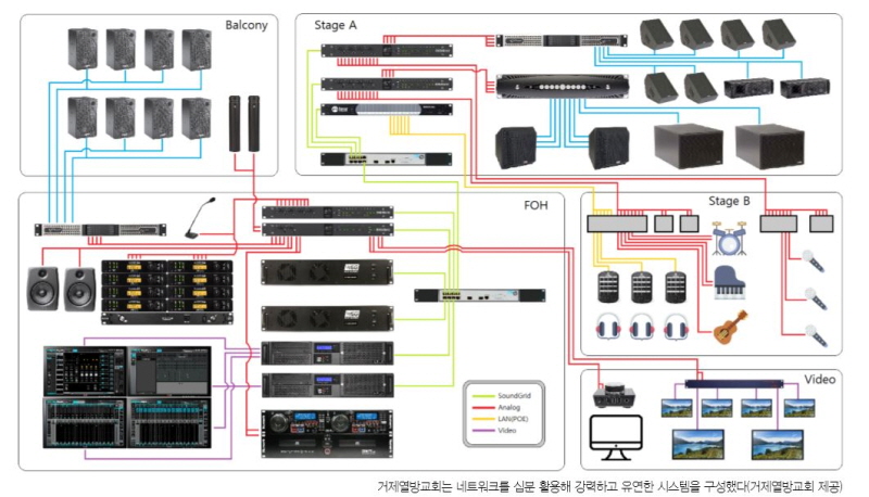 거제 열방교회 - 네트워크 음향 시스템으로 다음 시대를 준비하다 by 이무제 자료제공 : 거제열방교회, (주)비엘에스, (주)다산에스알 한 때 음향/영상 분야에서의 화두는 단연 ‘디지털’이었다. 디지털 시대의 초창기에는 전문가 그룹에서조차 적지 않은 반발이 있었지만 변화의 흐름은 너무나 분명한 방향을 가리키고 있었다. 이전과 비교할 수 없는 유연성과 편리성, 구성의 자유로움, 작은 폼팩터로 인한 편한 설치와 사용, 낮은 비용 등 무수한 장점으로 변화는 필연적일 수밖에 없었다. 그리고 오늘날 모든 음향/영상 시장은 라이브와 인스톨을 통틀어 디지털 도메인으로 완전히 재편되었다. 이 변화에는 그리 오랜 시간이 걸리지 않았다. 한편, 최근 네트워크 기술의 빠른 발전은 또 한번의 변화를 예고하는 것 같다. 네트워크 기술은 물론 디지털에 기반하는 것이지만 ‘서로를 잇는다’는 면에서 새로운 가능성을 가져다준다. 이전에는 디지털이라고 해도 신호를 분기하거나 공유하기 위해 별도의 배선작업이나 혹은 전용 컨버터, 스네이크 박스 등을 사용해야 했다면 네트워크 시대에는 저렴한 랜 케이블과 범용 네트워크 스위치를 이용해 자유롭게 시스템을 구성하고 사용 환경의 변화에 따른 유연한 대처까지도 가능해졌다. 디지털 기술의 장점들이 네트워크라는 날개를 달고 훨씬 큰 가능성으로 도약할 수 있게된 것이다.