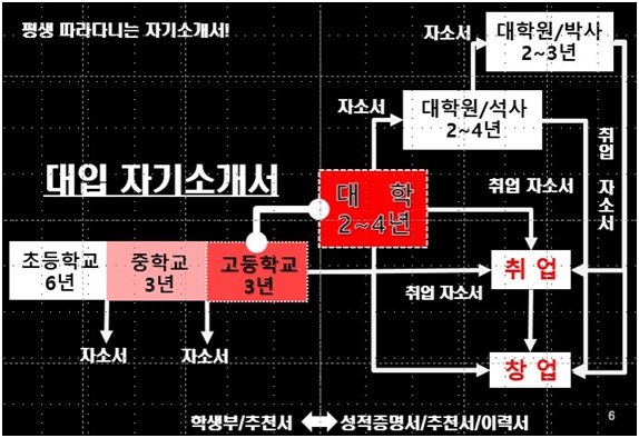 가장 중요한 단계는 대학입학이다. 입시에서 학생부종합전형으로 대학에서 자기소개서를 거의 필수 서류로 요구한다. 대학원 석사와 박사 과정 진학을 위해서도 자기소개서는 빠지지 않는 기본 요건이다. 둘째, 자기소개서는 취업에 꼭 필요한 제출 서류다. 학업을