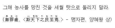 고대 중국 춘추전국시대에 양나라 혜왕이 맹자에게 고민을 털어놨습니다. 흉년이 든 지역 백성을 구하기 위해 다른 지역 곡식을 가져다가 적극적으로 구휼했습니다. 하지만 백성을 위한 정치에도 불구하고 이웃나라에 비해 백성이 늘어나지 않는다는 푸념이었습니다. 양혜왕은 그 이유가 무엇인지 맹자에게 물었습니다. ‘어진 정치를 베풀면 백성들은 이를 본받아 분수(分數)에 맞게 살 것입니다. 왕께서 걱정하는 것처럼 아랫사람이 윗사람을 해치는 일은 일어나지 않을 것입니다. 또한 나라를 오랫동안 다스릴 수 있을 것입니다‘ 맹자는 왕이 패권주의에 물들지 않고 백성을 중심으로 도덕정치(道德政治)를 베풀어야 한다고 강조했습니다. 비로소 백성들도 인의(仁義)정신을 받들어 왕에 대한 무한 신뢰와 충성을 하게 된다는 가르침을 준 것이지요. 위 문구를 그대로 해석해보면, “흉년의 탓으로 돌리지 말라. 백성의 기아를 금년의 기후가 나빴기 때문이라고 하거나 잘못이 흉년에 있다는 등과 같이 세월을 탓하지 않아야 한다. 그것을 왕 스스로의 책임이라 여기고 정치를 한다면, 천하의 농민들이 모두 기뻐하면 왕의 치하로 모여들 것이다.”라는 의미입니다. 과연 말 그대로 흉년이 왕의 책임이었을까요? 맹자는 흉년이 들어 농사를 망친 모든 탓을 나쁜 기후나 백성의 책임으로 전가하지 말라는 충고를 덧붙인 것입니다. 어쩔 수 없는 결과라도 사태 수습을 왕이 짊어진 채 최대한 빨리 종결짓도록 대책 마련이 현명합니다. 그래야 내부적으로 민심이 흉흉해지거나 기아에 시달리지 않을 수 있습니다. 바로 책임 있게 발 빠른 대책을 수립해야 함을 언급(言及)한 것입니다. 가령 평화로운 태평천국(太平天國) 시대를 누린다고 칩니다. 외부로부터 침입도 없습니다. 어떠한 적의 침공도 능히 무찌를 수 있는 강한 힘을 가지고 있습니다. 여기에 내부적으로 단단한 결속력으로 흔들림이 없습니다. 그러나 심각한 흉년(凶年)이 들면 그 민심은 순식간에 흉흉해집니다. 도처에 도둑이 들 끊고, 서로를 불신하며 시기하는 무리들이 판을 치게 됩니다. 여기에 곳간의 곡식들을 강탈당하면 심각한 상태에 이릅니다. 결국 입에 풀칠도 못할 정도가 되면 응당 구원의 손길을 기다리게 되는 것이지요. 백성을 위한 정치가 절실할 때입니다. 현대사회는 다양한 직업군으로 전문화되고 세분화되어 움직입니다. 농사짓기처럼 자연환경에 의존하기 보다는 대부분 인적(人的) 관리와 물적(物的) 관리로 나눠지게 되고 일을 추진하는 과정에서 크고 작은 불상사(不祥事)가 생겨나게 됩니다. 그 가운데 가장 말이 많은 부분은 책임에 대한 소재파악과 누군가가 그 책임을 피할 수는 없다는 것이지요. 반드시 억울한 사람도 생겨나고 더러는 자신을 희생해서 모든 책임을 다 스스로가 지겠다는 의인도 있겠지만, 가장 경계해야 할 것은 ‘책임전가(責任轉嫁)’를 하려는 악의적인 마음입니다. 천재지변(天災地變)이 아니라면, 잘못된 원인은 반드시 내부로 향해 있습니다. 그 원인제공을 그 누군가가 아니라, 내가 저지른 일이라면 억울할 일이 하나도 없겠지요. 맹자는 인(仁)은 사람들의 편안한 집이고 의(義)는 사람들의 바른 길임을 알 때, 올바른 정도(正道)의 이치를 깨달을 수 있다고 했습니다. 본인의 잘못을 깨닫고 있다면, 과감히 그것을 인정하고 반성하는 시간을 스스로 가져보는 것도 결국은 자신을 위해 올바른 길을 선택한 것임을 명심해야 할 것입니다. 결국 ‘남 탓 네 탓’을 하면 할수록 그만큼 내 주위에는 불신(不信)과 저해(沮害) 세력들이 양산될 것이며, ‘내 탓’으로 그 책임을 인정하고 새로운 해결방안을 찾고자 노력한다면 내 주위에는 어느새 나를 인정하고 존경하는 사람들이 모여 든다는 사실을 늘 잊지 말고 살아가야 할 것입니다.