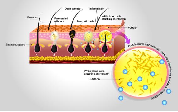 피부에서 털이 나오는 구멍을 모공이라고 합니다. 모공 근처에는 피지샘이 있습니다. 여기서 분비된 기름 성분의 피지가 모공을 통해 나옵니다. 이 피지가 피부를 건조하지 않게 만드는데요. 여러 가지 이유로 피지 분비량이 많아지거나, 모공이 피부 각질로 막혀 배출되지 않으면 바로 여드름이 되는 것입니다. 모공 속에는 P.acnes (프로피오니박테리움 아크네스)라는 여드름 균이 살고 있습니다. 피부 각질에 막혀서 배출되지 않는 피지는 여드름 균의 영양분이 되지요. 좁쌀처럼 오돌토돌하게 올라온 면포성 여드름은 심하지 않은 상태이며, 검붉게 변해 모공 사이에 고름이 차면 증상이 심한 염증성 여드름으로 볼 수 있습니다.
