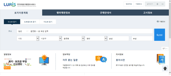 자기가 현재 소유한 토지가 있다면 이 사이트에 일단 먼저 들어간다. 들어가게 되면 ‘토지이용규제서비스’ 의 기본창이 열린다.