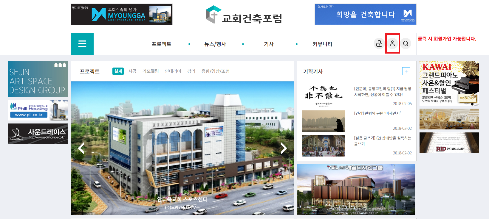 교회건축포럼은 교회건축에 관한 정보를 얻고자 하는 모든 분들이 이용하실 수 있는 온라인 매거진이나, 회원 가입을 하시면 뉴스레터를 통해 정기적인 교회건축분야 관련 소식 및 세미나 등 각종 소식을 받아보실 수 있습니다. 또한 회원 한정으로 현재 신축/재건축/리모델링/인테리어/교회음향,영상,조명 등 각 분야에 걸쳐 자세한 상담을 진행해드립니다. 아래의 화면과 같이 홈페이지 메인에서 우측 상단의 사람 모양 아이콘을 클릭하시면 회원가입을 하실 수 있습니다.