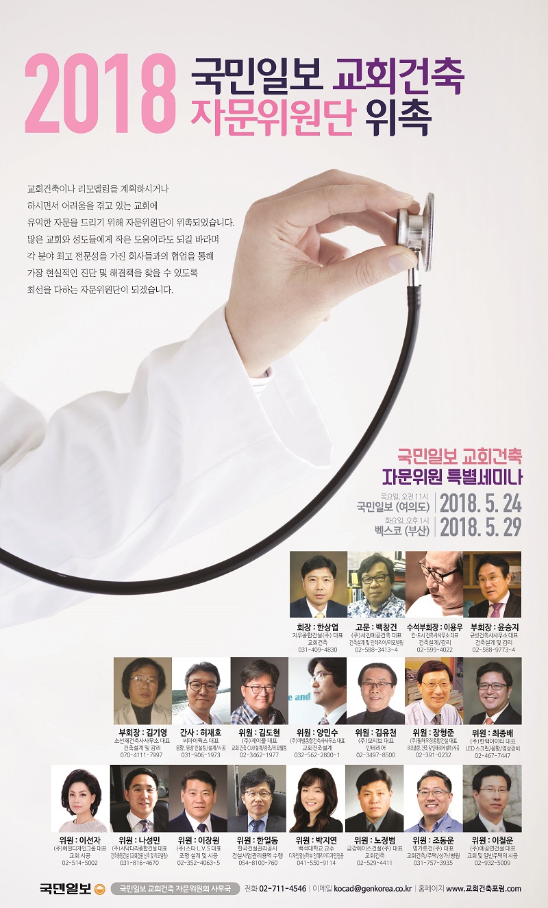 교회건축 각 최고의 전문가들의 강의를 들을 수 있는 국민일보 교회건축자문위원 특별 세미나가 2018년도 상반기에 개최됩니다. 세미나 참석을 원하시는 목회자 여러분께서는 상단의 세미나 신청서를 다운받으신 후 사무국 이메일 kocad@genkorea.co.kr로 보내주시면 신청 완료됩니다.