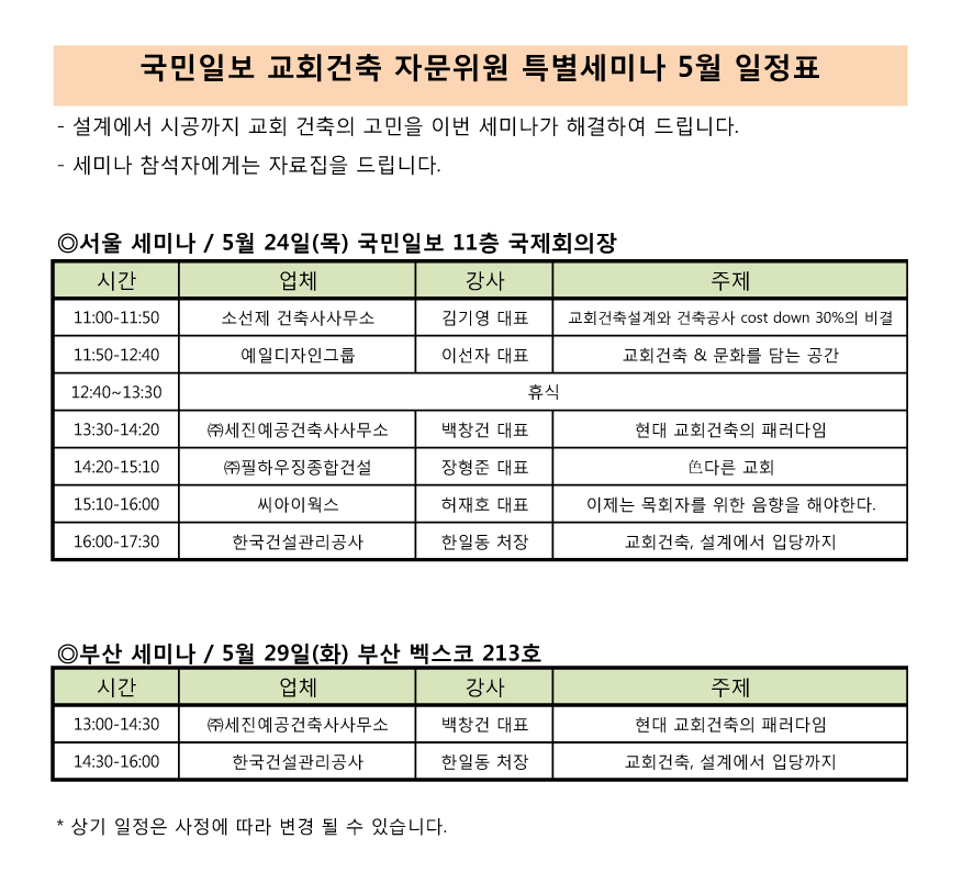 <세부 일정안내> - 서울 세미나 - 일시 : 5/24(화) 11:00~17:30 (12:00~13:00 점심시간) - 장소 : 여의도 국민일보빌딩 11층 국제회의실 13:00~16:00