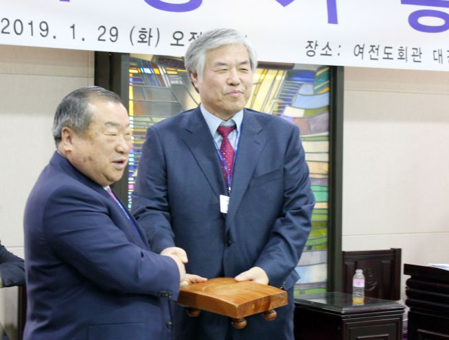 ▲엄기호 직전 대표회장이 전광훈 신임 대표회장(왼쪽부터)에게 의사봉을 전달하고 있다. ⓒ이대웅 기자