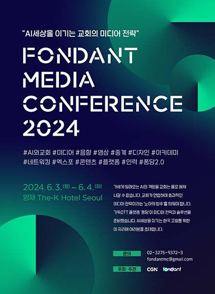 2024 퐁당 미디어 콘퍼런스 (FMC24)가 오는 6월 3-4일 양재동 The-K호텔에서 개최됩니다. 지난 해에 이어 두 번째로 열리는 FMC24는 올해 'AI, 세상을 이기는 교회의 미디어 전략은?'이라는 주제로 진행됩니다. 첫째 날에는 이재훈 CGN 이사장, 최진호 교수(미 에모리대 컴퓨터공학과), 김도균 대표(Cloudflare 한국지사) 등이 강연합니다. 이재훈 이사장은 AI와 한국교회 및 퐁당2.0에 대해, AI 툴을 직접 만드는 사람으로서 최진호 교수는 AI가 어떤 가치관으로 다음 세대 학습을 도울 것인지 여러 사례 및 대안을 제시합니다. 김도균 대표는 AI 기술이 초고속으로 확장되고 있는 시대에, 보안과 대비 방안에 대한 내용을 전할 예정입니다. 이어 박은지 AI 문화경영연구소장 진행으로 참석자들과 질의응답도 진행됩니다. 특히 교회에서 바로 AI 툴을 활용할 수 있는 몇 가지 사례를 만들어 보여주는 실전 강의 시간도 있습니다. 둘째 날은 AI 실무 활용을 위한 다양한 선택강의들이 진행됩니다. 음향과 중계기술, 촬영, 디자인과 자막, AI 활용 교육사례, 퐁당 콘텐츠 활용 방법 등 미디어 실무자들에게 도움이 되는 내용의 강의들로 직접 실습도 해볼 수 있습니다. 이재호 대표(미국 리빙사운드), 조명연 대표(CM MEDIA GROUP), CGN 제작기술실 등이 강사로 참여합니다. 이번 FMC24 기간 동안 강의 외에도 약 20개 기관이 참여하는 엑스포, 구인 정보와 기회를 얻을 수 있는 리크루팅존, 기독 굿즈들을 판매하는 팝업스토어까지 마련했습니다. 참가자 기념품 및 경품 이벤트까지 준비하고 있으니 이번 FMC24 기간 동안 유익과 재미, 네트워킹까지 얻어가는 기회가 되길 바랍니다. FMC24 홈페이지를 통해 사전 등록을 받고 있으며, 사전등록 시 할인 혜택도 있습니다.