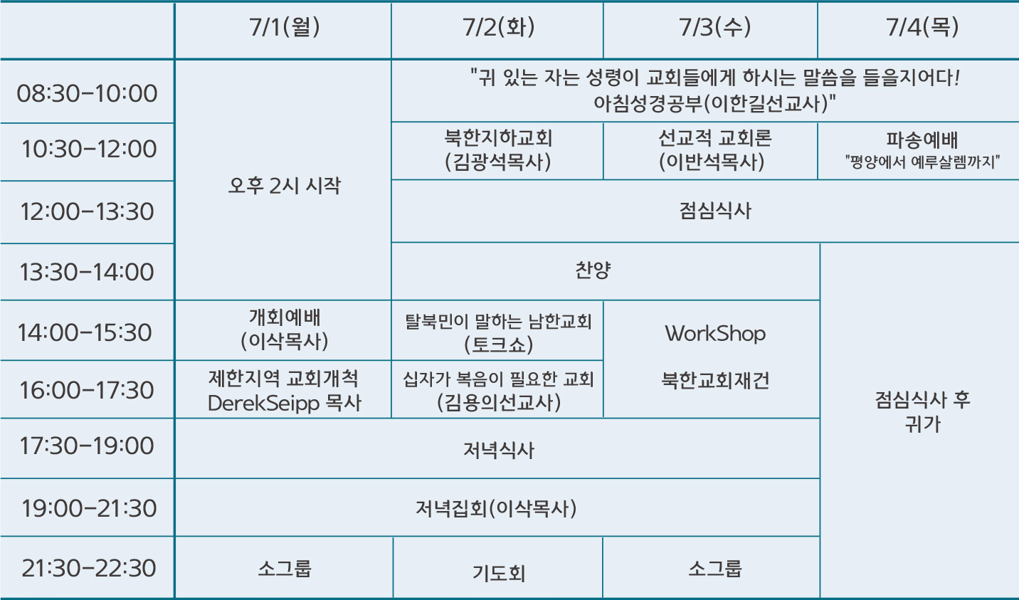 “귀 있는 자가 성령이 교회들에게 하시는 말씀을 들으라”는 주제로 아래와 같은 내용으로 진행될 예정이다.