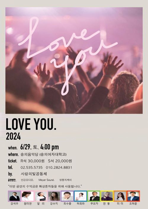 6월 29일 오후 4시 숭의대학교 음악당에서는 사랑의빛공동체 주최로 'LOVE YOU 2024' 자선콘서트가 개최됩니다.