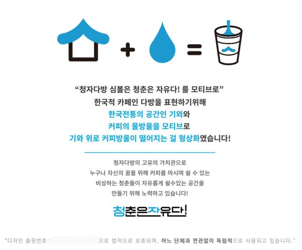 그러면서 '신천지 의혹'을 의식한 듯 해당 디자인에 대해 "법적으로 보호되며, 어느 단체와 연관없이 독립적으로 사용되고 있다"는 단서를 달았다. 또 청자다방의 '청자' 역시 '청춘은 자유다'의 준말일 뿐이라고 한다.