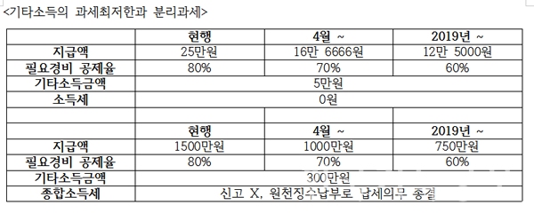 한편 기획재정부는 지난 1월 8일 소득세법 시행령 입법예고를 통해 기타소득의 필요경비율을 단계적으로 축소한다고 발표했다. 현재 지급액의 80%를 필요경비로 인정해주지만 오는 4월부터는 그 비율을 70%, 다음해부터는 60%만을 공제한다.