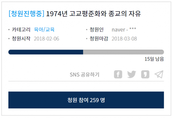 최근 청와대 국민청원 게시판에 '1974년 고교평준화와 종교의 자유'라는 제목의 청원 요청 글이 올라왔다.