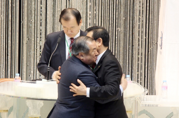 ▲대표회장에 선출된 엄기호 목사(왼쪽)가 임시의장 김창수 목사와 포옹하고 있다. ⓒ이대웅 기자