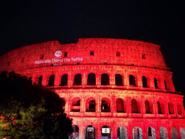 24일(현지시간) 로마의 콜로세움이 붉은 색으로 물들었다. 이는 박해받는 기독교인들을 기념하기 위한 전 세계적인 캠페인의 일환이다.