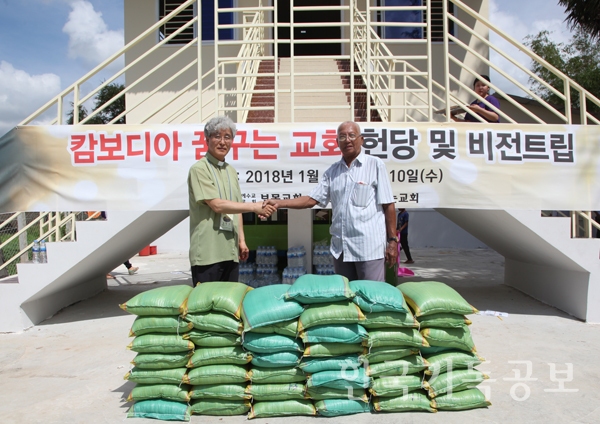 제주노회 보목교회(김인수 목사 시무)는 지난 1월 7일 캄보디아에서 지교회 '캄보디아 꿈꾸는교회' 헌당예배를 드리고, 캄보디아를 향한 하나님의 사랑을 전했다. 이를 위해 보목교회는 지난해 초 캄보디아 껀달 주의 더므라이출렁 마을에 교회를 세우기로 결의하고, 온 교인들이 선교의 마음을 모아 지난해 7월 1일 기공예배로 건축을 시작해 그해 12월 24일, 2층 규모의 예배당을 완공했다. 헌당예배와 함께 1월 4~10일 진행된 비전트립은 교육부 학생 30명과 장년 21명 등이 참여해 쌀 110포대를 전달하고, 워십과 댄스 등 문화 공연을 선보여 참여한 700여 명의 주민들로부터 큰 호응을 받았다고 전해졌다.