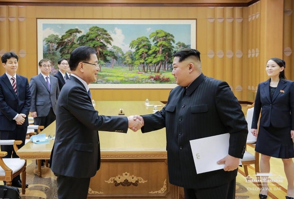 ▲악수하고 있는 정의용 청와대 국가안보실장과 북한 김정은 위원장 ⓒ청와대
