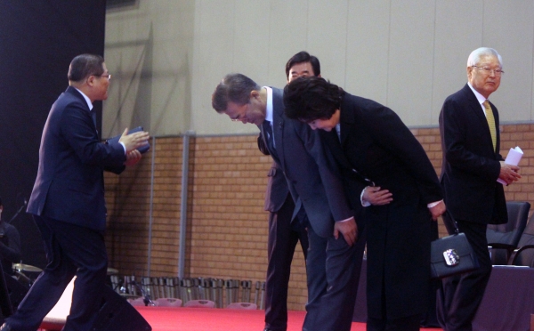 ▲문재인 대통령 부부가 참석자들을 향해 허리를 숙여 인사하고 있다. ⓒ김진영 기자