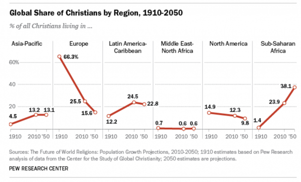 ▲전세계 기독교인 인구 대비 지역별 기독교인 비율 그래프(Global Share of Christians by Region, 1910-2050). ⓒPew Research Center