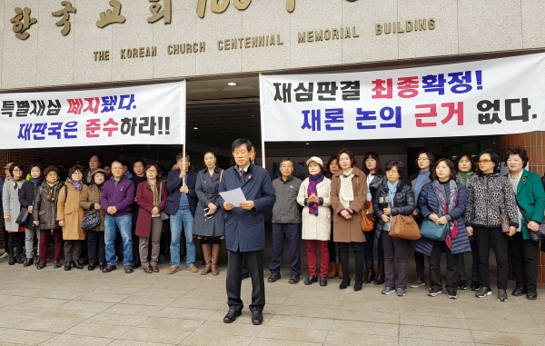 박 목사는 "천인공노할 1·15 사태 이후 1년 2개월 동안 노회와 총회뿐 아니라 모든 법원에서 서울교회 당회장으로 인정하는 저와 저를 지지하는 성도님들의 교회 건물 출입이 불법으로 막혀 있었다"며 "그리하여 1,300여명의 성도님들이 지난 1년 2개월 동안 이루 말할 수 없는 어려움 속에 예배를 드렸고, 예배방해금지가처분이 1·2차 인용되고 간접강제까지 인용됐음에도 막무가내로 막아서는 자들로 인해 건물을 사용하지 못하고 있다"고 밝혔다.