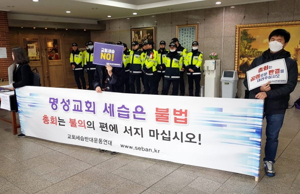 13일 예장 통합 총회재판국 판결이 진행되는 동안, 재판정인 서울 연지동 한국교회100주년기념관 1층 소강당 바깥에서는 명성교회와 관련해 세습을 반대하는 피켓시위가 벌어졌다.