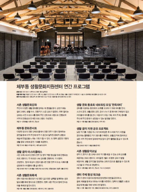 체부동 생활문화지원센터는 일제강점기에 지어져 87년 역사를 가진 옛 ‘체부동 성결교회’를 고쳐서 다시 쓰는 도시재생방식으로 이후 지역 주민과 시민오케스트라를 꿈꾸는 이들을 위한 거점공간으로 쓰일 예정이다.
