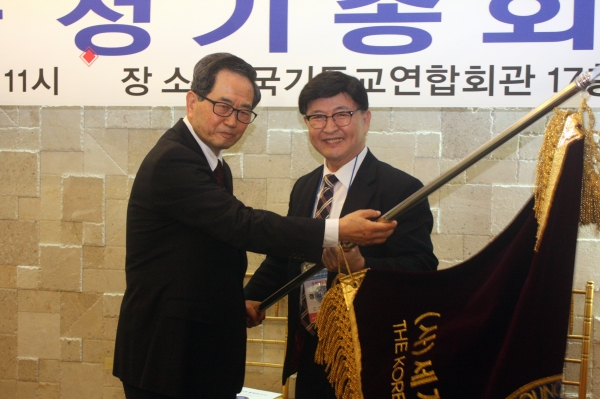 ▲세기총 직전 대표회장 황의춘 목사(왼쪽)가 신임 대표회장인 정서영 목사에게 세기총기를 전달하고 있다. ⓒ김진영 기자