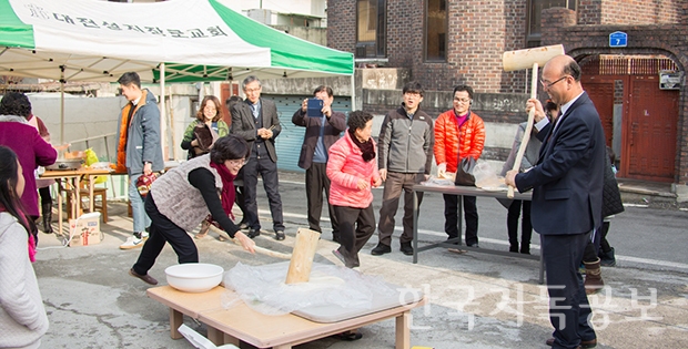 ▲ 지역주민들과 교인들이 어울려 떡메를 치고 즐거운 시간을 보내고 있는 모습. 【대전=이경남 기자】대전서노회 대전성지교회(심상효 목사 시무ㆍ사진)가 위치하고 있는 대전 중구 목동 지역은 재개발을 위한 준비 작업이 한창이다. 종교시설인 교회와 주택 몇 곳을 제외하고 90%의 주민들은 이주를 마쳤다. 65년간 지역을 섬겨온 대전성지교회도 재개발 영향으로 잠시 숨을 고르며 새 도약을 준비하고 있다. 교회는 새 부지를 구입하고 예배당 건축을 준비중이다. 심상효 목사는 "2020년 새예배당 완공을 목표로 하고 있다"며 "교회 시설 중에 마을 주민들을 위한 공간으로 어떤 것을 준비할지 논의중이며, 형편이 어려운 지역주민들의 필요를 파악하고 교회가 이를 뒷받침하는 공간을 반드시 마련할 것"이라고 강조했다. 교회가 지향하는 마을목회에 대해 심상효 목사는 "지역 주민들의 현실적 어려움을 외면하지 않고 교회가 함께 해결하는 데 힘쓰고, 마을의 행사나 잔치에 관심을 기울이고 마음과 물질로 지원하고 있다"며, "교회와 지역이 좋은 관계를 맺을 때 주민들은 교회를 마을의 일원으로 받아들이게 되고, 전도의 열매도 기대할 수 있을 것"이라고 말했다. 교회는 총동원전도주일 같은 일회성 행사보다 기독교생태계 조성을 위해 지역 주민들이 겪고 있는 어려움을 돕는 데 힘쓰고, 특히 취약계층 주민들을 돌아보며 아픔과 고통을 나눠지는 데 힘써 왔다. 마을에서 진행하는 어려운 이웃을 위한 김장담그기, 지역 푸드뱅크, 독거노인 돌봄, 바자회, 경로당 등 지역과 관련된 일에 적극 동참하고 있다. 방과 후 돌봄이 필요한 아이들을 위해 2004년부터 시작한 성지홈스쿨은 현재 25명의 다음세대들을 돌보고 있다. 이곳에서 아이들은 가정에서 지원받지 못한 다양한 악기수업, 영어공부, 체험활동 등을 통해 즐거운 방과 후 시간을 갖는다. 성지홈스쿨의 돌봄을 받는 아이들은 자연스럽게 교회로 발길을 향했다. 교회가 홈스쿨사역을 시작한 지 1년 만에 정부에서 관련 지원정책이 시작됐고, 기업도 적극 지원해주고 있다. 심상효 목사는 "한국교회는 정부가 시행하는 다양한 복지지원 정책을 파악하고 초교파적으로 이 일을 위해 협력해나갈 필요가 있다"며, "정부제도를 현재는 원불교와 불교가 적극 활용하고 있는데, 우리 교단도 점차 확장되는 정부 복지정책에 관심을 갖고 교회가 사회선교를 효율적으로 펼쳐나갈 수 있도록 관련 정보를 제공하면 좋겠다"고 제안했다. 성지홈스쿨에서는 관련 자격증을 취득한 성도들이 강사로 나서 성폭력, 학원폭력, 가정폭력, 불량식품 등 아이들의 실생활에도 도움이 되는 다양한 교육과 상담도 진행된다. 한편, 교회는 전도활동도 열심이다. 솜사탕, 스무디, 팝콘, 부침개 등 어른이나 어린이 모두가 좋아하는 메뉴를 준비하고 거리전도활동을 펼친다. 화요일에는 권사회를 중심으로, 금요일에는 전 교인이 순번을 정해 거리전도를 하고 있다. 인근에는 초등학교 및 중고등학교가 여럿 있어 전도에 열심을 낸만큼 다음세대들이 꾸준히 유입되고 있는 실정이다. 심상효 목사는 해외선교의 중요성도 교인들과 공유하며 2015년에는 인도에 네팔 현지인 선교사를 파송했다. 대전서노회 이단대책위원장을 맡고 있는 심상효 목사는 "세계 곳곳에서 이단문제가 심각하다"며 한국교회가 세계 선교를 효율적으로 감당해야 할 당위성을 강조했다. 특히 "새 예배당이 선교의 구심점이 되길 기대한다"며, "이슬람의 남하를 막고 있는 아프리카 대륙의 우간다, 콩고, 나이지리아, 에티오피아를 중심으로 복음화를 확장시키는 일에 힘쓸 것"이라고 말했다. 현재 에티오피아와 나이지리아는 기독교인구가 꾸준히 증가 중이다. 대전성지교회는 예배나 기도회 때마다 나라를 위한 기도를 빠뜨리지 않는다. 특히 동성애문제, 이슬람대책 등 기독교 현안과 관련해 주님의 뜻 안에서 법개정이 이루어지도록 전교인이 힘써 기도하고 있다. 교회의 본질인 예배와 전도, 기도와 말씀이 살아 있고, 마을 주민들의 기쁨과 고통을 함께 나누는 대전성지교회의 새로운 도약이 기대된다. 심상효 목사는 이단사이비문제 전문가다. 대전성시화운동본부 이단대책위 초대 위원장, 대전이단상담소 소장, 총회 전문이단상담사, 이단대책위원장으로 활동하며 이단사이비 문제의 심각성을 알리고, 이단에 빠진 사람들이 다시 교회로 돌아오도록 돕고 있다. 2016년에는 이단관련 전문가들과 세계 곳곳에서 활발한 포교활동으로 세력을 키워가는 대표적인 이단세력인 이슬람, 구원파, 통일교, 하나님의교회(구 안산홍증인회), 신천지의 태동과 교리 등을 자세히 기술한 대전서노회 이단상담소 자료집 '이단정보'를 한영판으로 출간했다. '이단정보'는 정확한 이단 정보와 한국교회의 올바른 대처방법까지 수록해 호응이 좋아 증보판을 곧 내놓을 계획이다. 심상효 목사는 "이단의 교주들 중 상당수가 계룡시 출신이어서 대전 지역에 이단들이 많이 분포하고 있다"며, "교회 인근에도 한국교회가 이단 사이비 단체로 규정한 이단 사이비 단체나, 점집이 즐비하다"고 말했다. 이단관련 대책을 언급하며 심 목사는 "이슬람 