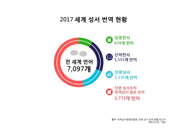 세계성서공회연합회(United Bible Societies, UBS)는 하나님 말씀이 최소한 단편(쪽복음)이라도 번역된 언어의 수가 전 세계 언어 7,097개 중 3,324개(2017년 12월 말 기준)라고 발표했다.