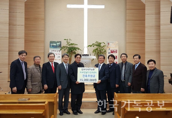 ▲ 이주민월드비전센터 이사장 이정원 목사(사진 가운데 왼쪽)가 캄보디아 선교센터 건축헌금을 전달하고 있다.