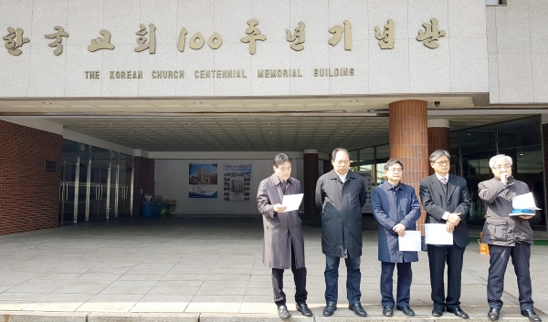 예장 통합 목회자운동단체 5곳이 공동으로 26일 오전 총회가 위치한 서울 연지동 한국교회100주년기념관에서 성명서를 발표하는 기자회견을 개최했다.