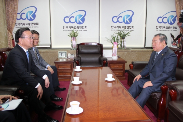 29일 오전 한국기독교총연합회를 내방하고 대표회장 엄기호 목사와 환담을 나눴다.