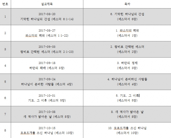 ▲에스더서 설교 제목(왼쪽)과 원로목사의 저서 목차(오른쪽).