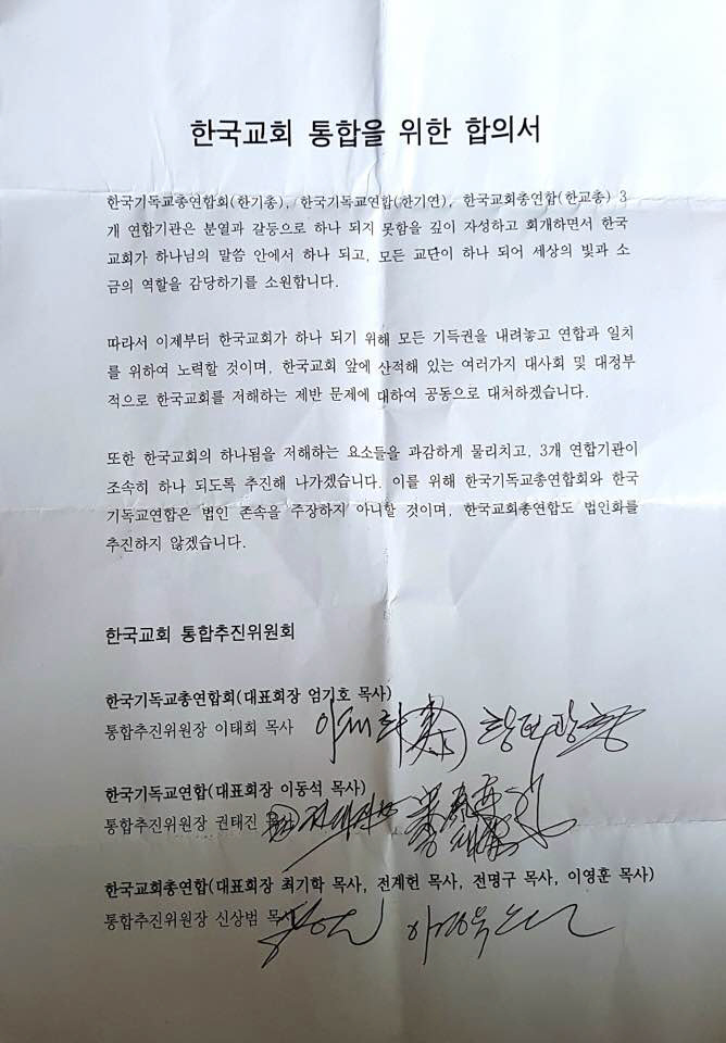 이날 합의서는 한기총 통추위원장 이태희 목사와 통추위원 황덕광 목사, 한기연 통추위원장 권태진 목사와 송태섭 목사, 한교총 통추위원장 신상범 목사와 통추위원 이경욱 목사 등 6인이 참석해 사인했다.