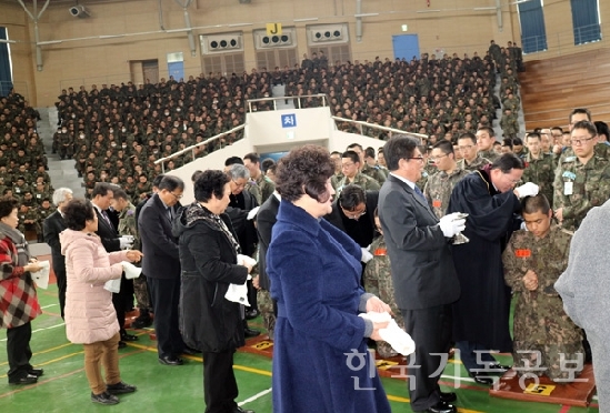 군선교연합회 대경지회 육군훈련소 세례 지원 【대구동서남 지사】 (사)한국기독교군선교연합회 대경지회는 지난 2월 24일 충남 논산 육군훈련소 연무관에서 제522차 진중세례식을 후원 개최했다.이날 400여 명이 참석해 훈련병 4400여 명에게 세례를 베풀었다. 대경지회는 육군훈련소 진중세례식 연중 18회 중 1회를 지원하며, 대구경북 군부대의 진중세례식도 총 35회를 거행하고 있다.세례식은 김택조 목사(연무대군인교회)의 인도로 열려 부이시장 양득천 장로의 기도, 대경지회 부회장 김지원 권사의 성경봉독, 증경회장 김승동 목사의 '내가 예수를 만난다면' 제하의 말씀 등으로 진행됐다.한편 세례식에 앞서 연무대군인교회 새성전을 둘러보고 차질없는 완공을 위한 특별기도회를 가졌다. [출처] 한국기독공보 http://www.pckworld.com/news/articleView.html?idxno=76229관리자 I 2018-03-05