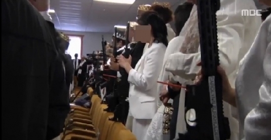 ▲소총을 든 채 합동결혼식 중인 통일교 생추어리 교회 신도들. ⓒMBC 캡처