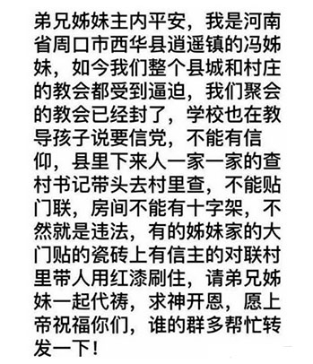 갖는 것도 허용되지 않고 있다"고 주장했다. 또 "정부 관리들이 집집마다 들이닥쳐 조사했다. 성경구절 족자, 기독교 관련 그림, 십자가 소유는 금지됐다"며 중국교회를 위한 긴급 기도를 요청했다.