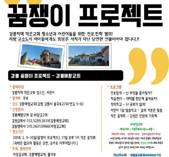 진로·진학 캠프 '꿈쟁이 프로젝트'를 강릉 율곡로 강릉예향교회에서 오는 2월 9-10일 이틀간 개최한다.