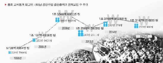 전국교회 경상수입 결산액, 100억 9천만원 감소2018년도 경비절감, 지출효율화 등 긴축재정 예상돼 올해 교회들은 어려움 없이 선교, 교육, 봉사의 사역을 잘 이어갈 수 있을까. 대한예수교장로회 지난 102회 총회에 보고된 바에 따르면 전국교회의 경상수입 결산총액이 전년대비 100억 9000여 만원이 감소해, 올해 교회는 더욱 긴축재정을 펼칠 것으로 예상된다. 통계청이 12월 29일 발표한 2017년 연간 소비자물가 동향에 따르면 소비자물가지수는 전년에 비해 1.9% 상승한 것으로 발표됐고, 한국은행이 12월 28일 내놓은 2018년 기업경기전망에 따르면 내년도 제조업 전망은 2017년 실적 BSI(기업경기실사지수)에 비해 1포인트 낮게 전망했다. 회사가 어려워지고 물가는 오르면 성도들은 허리띠를 더욱 졸라맨다. 성도의 재정상태가 교회에 미치는 영향이 무관하지 않기 때문에 교회도 함께 경비절감과 지출효율화를 고려할 필요가 있다. 총회에 보고되는 전국교회의 경상수입 결산총액의 그래프가 최근 몇 년 동안 위아래로 요동치고 있다. 총회 회계기준에 따르면 경상비 수입항목은 십일조헌금, 주일헌금, 절기헌금, 목적헌금, 기타헌금, 잡수입 등이며 건축헌금은 경상비수입에서 제외된다. 이 기준으로 보고된 전국교회의 경상비 수입결산 규모는 2016년 12월말 현재 1조 3147억 8000여 만원이다. 이는 전년대비 0.76% 감소한 것이며, 금액으로는 100억 9600여 만원의 수입이 줄어든 것이다. 전년대비 전체 교인 수는 5만 8000여 명이 감소했다. 전국교회의 경상수입 결산총액은 IMF 시기였던 1998년 이후 10년간 계속 상승세였으나, 2008년 1조 3346억 6000여 만원이라는 최고점 이후 2009년부터 감소와 증가를 오르내리고 있는 중이다. 교회들의 경상수입 결산 총액이 줄어드는 현상은 매년 노회서 올라오는 '총회 상회비 삭감' 헌의안과도 무관하지 않다. 정책입안의 기초자료가 될 2017년 통계입력이 시작됐다. 최근 2년간 줄어든 성도가 8만 명을 육박한 가운데 올 가을 제103회 총회에 보고되는 통계자료에 귀추가 주목된다.[출처] 한국기독공보, 이수진 기자 sjlee@pckworld.comhttp://www.pckworld.com/news/articleView.html?idxno=75807 관리자 I 2018-01-01
