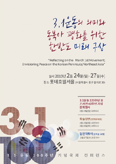3.1운동 100주년 기념 국제 컨퍼런스 25~27일 롯데호텔, '3.1운동의 의미와 동북아 평화를 위한 한반도 미래 구상' 한국기독교교회협의회(NCCK)와 한국YMCA전국연맹, 한국기독교사회문제연구원과 평화통일연대, 여의도순복음교회 등 교회 및 단체가 오는 25~27일 롯데호텔에서 '3.1운동 100주년 기념 국제 컨퍼런스'를 공동 개최한다.'3.1운동의 의미와 동북아 평화를 위한 한반도 미래 구상'을 주제로 열리는 이번 컨퍼러스에서는 윤경로 명예교수(한성대), 위르겐 몰트만 명예교수(튀빙엔대), 백낙청 명예교수(서울대), 박종화 이사장(평화통일연대), 민경배 교수(백석대), 정운찬 전 총장(서울대), 백영서 교수(연세대), 장미란 박사(여성평화운동가), 이재정 교육감(경기도교육청), 박기호 교수(풀러신학교), 윤덕민 박사(전 국립외교원장) 등이 강사로 나서 △3.1운동의 역사와 한국 사회의 미래 △3.1운동 정신과 종교 간 협력 △통일시대를 준비하며 △한반도평화를 위한 그리스도인의 책임과 시민사회의 역할 △변화된 국제환경에서의 한반도 평화 등을 주제로 발제할 예정이다.주최 측은 이번 세미나를 통해 "3.1운동 100주년을 맞아 3.1운동의 정신을 되새기고 지난 100년의 역사와 그 의미를 성찰할 뿐만 아니라 동북아와 한반도 평화 실현을 위한 기독교적 가치와 비전을 제시해 미래 100년을 위한 한국교회와 기독교인의 과제와 역할을 모색할 것"이라며 관심과 참석을 요청했다.임성국 기자 [출처] https://www.pckworld.com/article.php?aid=7969431998 한국기독공보관리자 I 2019-02-18