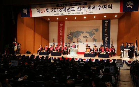 “꾸준히 발전하고 성장해 사회 혁신의 주체로 활동 하길” 한남대, 박사, 석사, 학사 등 총 2,037명 배출SHAREMore ▲한남대 제57회 학위수여식 현장. ⓒ한남대 제공▲한남대 제57회 학위수여식에서 총장공로상 수상자들과 관계자들이 기념단체사진을 촬영하고 있다. ⓒ한남대 제공미국 남장로교가 설립한 기독교 대학 한남대학교(총장 이덕훈)가 지난 15일 오후 1시30분 성지관에서 제57회 학위수여식을 개최했다. 학위수여식은 허태정 대전시장, 설동호 대전시교육감, 우영수 대전기독학원 이사장 등이 참석한 가운데 진행됐다. 이날 학사 1,739명, 석사 226명, 박사 28명, 공개과정수료 44명 등 총 2,037명의 졸업생이 배출됐다. 한남대는 총장이 졸업생 전원에게 단상에서 한 명씩 학위증을 수여했다. 이덕훈 총장은 “졸업생들은 한남대에서 보여준 열정과 패기로 빠르게 변모하는 사회 속에서 꾸준히 발전하고 성장해 나갈 것으로 믿는다”며 “특히, 재학 중 봉사활동과 학습을 결합한 서비스러닝을 기억하고 사회 혁신의 주체로서 활동하길 바란다”고 격려했다. 이후 시상식에서는 재학 중 683시간의 사회봉사활동을 펼친 김서영 씨(24·사회복지학과)가 한남봉사상, 만학도 래퍼로 유명한 임원철 씨(75·도시부동산학과)가 총장공로상을 받는 등 20여명이 수상의 영예를 안았다. [출처] http://www.christiantoday.co.kr/news/320133 크리스찬투데이관리자 I 2019-02-18