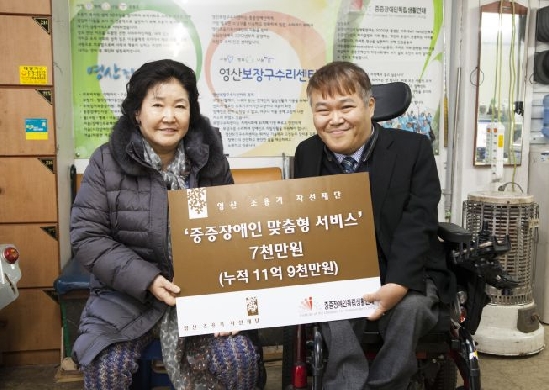 영산조용기자선재단, ‘장애인 맞춤형 서비스’ 후원 ▲(왼쪽부터) 김성혜 이사장, 윤두선 대표. ⓒ자선재단 제공영산조용기자선재단(이사장 김성혜·조승국)과 중증장애인독립생활연대(대표이사 윤두선, 이하 독립연대)는 지난 11일 서울 용산구 독립연대에서 김성혜 이사장과 독립연대 윤두선 대표, 재단 및 독립연대 관계자들이 참석한 가운데 ‘중증장애인 맞춤형 복지서비스’ 후원금 7천만원 전달식을 가졌다. ‘중증장애인 맞춤형 복지서비스’는 중증장애인들에게 대형빨래 무료 세탁 서비스를 제공하고, 전동휠체어 수리를 지원하여 보다 질 높은 생활 환경을 조성할 수 있도록 한다. 따라서 이번 후원은 중증장애인들의 복지를 증진하는 데 큰 의미가 있다. 김성혜 이사장은 “장애는 불편한 것일 뿐, 절대 차별받으며 살아가서는 안 된다”며 “재단은 장애인들이 겪고 있는 불편한 생활에 실질적인 도움을 제공하고자 지속적인 노력을 기울이겠다”고 말했다. 영산조용기자선재단은 2008년부터 11년간 독립연대에 11억 9천만원을 후원하고 있으며, 중증장애인들에게 서비스를 맞춤 지원하고 있다. 또한 장애 인식 개선, 치료비 지원 및 주택 개보수 등 저소득층을 위한 사업도 계속 지원하고 있다. [출처] http://www.christiantoday.co.kr/news/320002 크리스천투데이관리자 I 2019-02-13