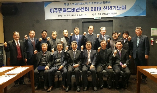 이주민월드비전센터, 선교사명 고취 국내 거주 이주민들을 전도해 고국에 선교사로 파송하는 이주민월드비전센터(이사장:이정원)가 신년기도회를 지난 1월 30일 아리랑힐호텔에서 갖고, 선교의지를 새롭게 다졌다.서울강북노회 이주민선교위원회 후원으로 열린 이날 기도회에서는 최근의 선교상황과 신년도 사업계획을 공유하고 이를 위해 합심 기도했다.이날 행사에서는 상임이사 9명의 위촉과 임명식도 열렸다. 상임이사로는 심길보 목사(남면교회), 이재팔 목사(의정부영락교회), 박은호 목사(정릉교회), 김준호 목사(의정부교회), 김정현 목사(동성교회), 이춘석 목사(참빛사랑교회), 심영섭 목사(삼양제일교회), 구제상 목사(동두천교회), 김동욱 목사(선곡교회) 등이 위촉됐으며, 부이사장 이철웅 장로(신성북교회)와 감사 정성철 장로(성북중앙교회)가 임명됐다.이번 상임이사 구성을 계기로 동역하는 이주민선교의 새로운 장이 열릴 것으로 이주민월드비전센터는 기대감을 갖고 있다.한편 기도회는 센터장 김찬묵 장로의 인도로 열려 부이사장 이철웅 장로의 성경봉독, 이사장 이정원 목사의 설교, 부이사장 오성현 장로의 대표기도, 이주민선교사 이익성 목사의 선교보고, 관리이사 이근성 장로의 사업계획 보고, 총무이사 노명석 장로의 광고, 전 노회장 박은호 목사의 축도로 진행됐다.신동하 기자 [출처[ https://www.pckworld.com/article.php?aid=7958268173 한국기독공보관리자 I 2019-02-07