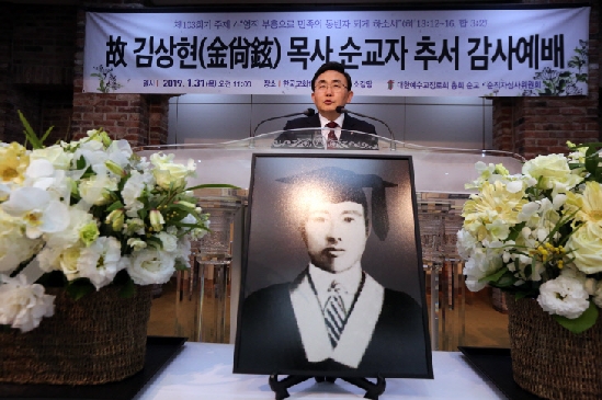 故 김상현 목사, 순교자 추서 감사예배 "민족의 아픔을 외면하지 않은 민족의 지도자, 김상현 목사" "목사님의 순교 신앙을 잊지 않고 기억하며 순교적 마음가짐으로 진실한 신앙생활을 하도록 힘쓰겠습니다."대한예수교장로회 총회 순교ㆍ순직심사위원회(위원장:김완식)는 지난 1월 31일 한국교회100주년기념관에서 '故 김상현 목사 순교자 추서 감사예배'를 드리고 순교자의 신앙을 기리며 순교 신앙 회복과 계승을 다짐했다.총회 순교·순직심사위원회 조직 후 총회의 공식 결의에 따른 최초의 순교자로 추서된 김상현 목사는 1882년 평안북도 철산군 출생으로 1905년 평북 용천군 용암교회에서 마포삼열 선교사 조사로 활동했고, 1919년에는 평북 정주지역의 3.1운동을 주도하기도 했다. 또 1925년 평양신학교를 졸업한 후에는 1926년 평북노회에서 목사 안수를 받고 노회장까지 역임했다. 하지만 1919년 평북 정주지역에서 3.1운동 만세 주동자로 체포돼 2년 여간 옥살이를 했고, 1945년 공산당 폭도들에게 고문과 구타를 당하면서도 목회에 전념하던 중 여독으로 1948년 생을 마감했다. 순교자 김상현 목사는 여전도회전국연합회 회장 김순미 장로(영락교회)의 외조부이기도 하다.총회 순교·순직심사위원회는 "김상현 목사님은 참 목자로 교회와 교인을 버리지 않고 끝까지 주어진 목회의 사명을 다한 하나님의 종이었다"며 또한 "그는 민족의 아픔을 외면하지 않은 민족의 지도자였다"고 평가했다. 김상현 목사의 유가족을 비롯해 목사 장로, 평신도 등 200여 명이 참석한 가운데 드려진 이 날 추서 감사예배는 총회 순교·순직심사위원장 김완식 목사의 인도로 김운성 목사의 기도, 한국여전도회 찬양단의 특송, 총회장 림형석 목사의 '지금은 우리가 죽을 때입니다' 제하의 설교와 한국교회순교자기념사업회 이사장 정영택 목사의 축도 등으로 경건하고 엄숙한 가운데 진행됐다.림형석 총회장은 설교에서 "김상현 목사님은 순교 정신으로 3.1만세 운동을 주도했고, 공산당에 의한 억압을 받아 세상을 떠나셨다"며 "나라와 교회를 위해 헌신하시다 돌아가신 목사님의 순교 신앙을 절대로 잊어서는 안 된다. 우리는 목사님의 순교적인 신앙을 기억하고, 본받아 하나님이 맡겨 주신 귀한 사명을 감당해야 한다"고 전했다. 이어 예배 후에는 이국현 목사의 사회로 순교자 추서예식이 진행됐다. 이기주 목사의 경과보고에 이어 림형석 총회장이 김상현 목사 유가족에서 순교헌정서를 수여했고, 증경총회장 채영남 목사와 평북노회 부노회장 표창술 장로의 격려사와 추모사 후 존영제막식과 김권수 목사의 마침 기도 등으로 진행됐다.채영남 목사는 "교회가 그동안 김상현 목사님이 목숨을 걸고 지켜낸 복음의 정신과 민족의 역사를 잃어버렸던 것은 아닌지 부끄럽고 죄송한 마음이 크다. 뒤늦게라도 목사님을 순교자로 추서하고, 목사님의 순교 신앙을 기릴 수 있어서 감사하다"며 앞으로 "교단과 한국교회는 김상현 목사님의 순교 신앙을 영원히 잊지 않고 계승해야 할 것"이라고 전했다.평북노회 표창술 장로는 "3.1운동 100주년을 맞이하는 뜻깊은 해에 민족의 자주독립을 위해 헌신하신 김상현 목사님의 순교 정신을 계승하기 위해 순교자로 추서하게 된 것을 진심으로 감사드린다"며 "목사님의 교회 사랑, 그리고 순교 정신이 한국교회와 성도들에게 널리 전파돼 다시 한번 부흥의 불길이 타오르길 바란다"고 전했다.이날 유가족을 대표해 인사한 김순미 장로는 "조상 때부터 내려온 믿음의 계보를 잘 이어가면서 순교적인 신앙 자세로 진실한 신앙생활을 하도록 힘쓰겠다"며 "가문에 순교자를 허락해 주신 하나님께 감사드린다"고 전했다.임성국 기자 [출처] https://www.pckworld.com/article.php?aid=7957249834 한국기독공보관리자 I 2019-02-01