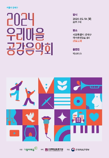 2024 우리마을 공감음악회 (5월) 한국교회총연합회(대표 장종현목사 주관)가 더불어배움과 문화체육관광부 후원으로 주최하는 '우리마을 공감음악회'는, 스포츠 및 관광은 40회 공연으로 이 지역을 빛낼 예정입니다. 이 문화 및 예술 프로젝트는 5월에 시작되어 12월까지 계속되며 지역 사회의 참여와 발전을 목표로 합니다. 올해 공감음악는 [함께]를 주제로 화합과 공동체의 화합을 강조합니다. 이번 행사는 지역 주민들의 유대감과 기쁨을 공유하고, 참여하고, 즐기고, 활기찬 지역사회 분위기를 함께 만들 수 있기를 기대하고 있다 5월 공감음악회는 18일(토) 원남교회, 19일(일) 강일교회, 25일(토) 평화교회, 26일(일) 푸른마을교회 총 4회 공연 예정이다. 자세한 사항은 thebaeum.or.kr 를 참고하시기 바랍니다. 2020년에 시작된 공감 콘서트는 문화 및 예술 참여의 유익한 영향을 강조하고자 합니다. 다양한 유휴 공간을 열린 공간으로 변화시킨 이번 콘서트는 현장 라이브 공연을 통해 치유와 회복, 공동체 유대 강화를 도모하는 것을 목표로 한다. 관리자 I 2024-05-18