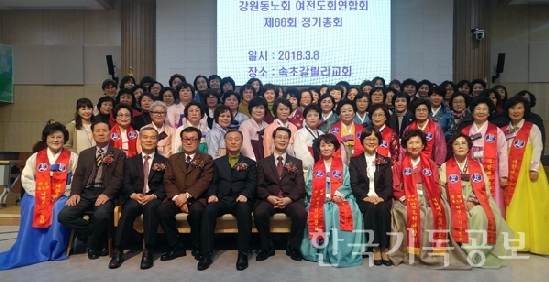 강원동 여전도회연합회 제66회 정기총회 개최 【강원동노회 연합회】 강원동노회 여전도회연합회(회장:김옥녀)는 제66회 정기총회를 지난 8일 속초갈릴리교회에서 개최하고 현안을 처리했다.이번 정기총회에는 5개 지역 27지회, 267명의 총대가 참석해 지난 회기 다양한 사업활동 내용을 공유하고 새로운 회기에도 선교, 교육, 봉사에 앞장 설 것을 다짐했다.한편 준비기도회는 전 회장 추정애 장로가 인도했으며, 개회예배는 회장 김옥녀 권사의 인도로 열려 노회장 신원홍 목사의 '예레미아의 눈물' 제하의 설교, 전국연합회 이윤희 총무의 격려사 후 축사를 정덕윤 목사(강릉동산교회), 최봉하 장로(강원동노회 장로회장ㆍ속초중앙교회), 권용길 장로(강원동노회 남선교회장ㆍ덕산교회) 등이 했다.특강은 이윤희 목사가 '하나님나라와 선교여성의 사명'을 제목으로 전했다. [출처] 한국기독공보http://www.pckworld.com/news/articleView.html?idxno=76416 관리자 I 2018-03-21