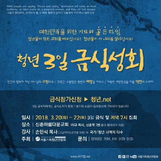신촌 아름다운교회에서 나라와 민족을 위해 기도하는 청년들의 모임인 서울기독청년연합회 주최 '청년3일 금식성회'가 오는 20일부터 22일까지 매일 오후 7시 서울 신촌아름다운교회에서 3일간 개최된다.